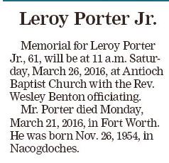 Services Saturday March 26 at 11 AM at Antioch Baptist Church on Greer St in Nacogdoches.